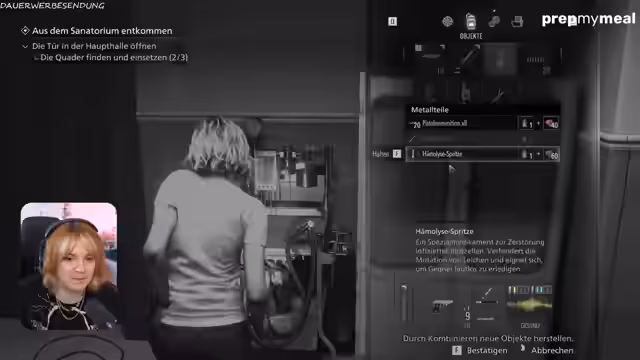 00:41:58Der Fokus liegt auf der Erkundung des Sanatoriums, das in Ost- und Westflügel unterteilt ist. yvraldis spielt Grace, die langsam und vorsichtig durch die Gänge schleicht. Wichtig ist das Sammeln von Ressourcen wie Blutproben, Metallteilen und Munition. Das Blut wird in einem speziellen Gerät verwendet, um durch Kombination mit Metallteilen neue Gegenstände wie Pistolenmunition oder eine Spritze zur lautlosen Eliminierung von Gegnern herzustellen. Die Spielfigur ist mit einer FBI-Vollautomatik ausgestattet, die jedoch Munition verschlingt und deren Aufmunitionierung zeitaufwendig ist.