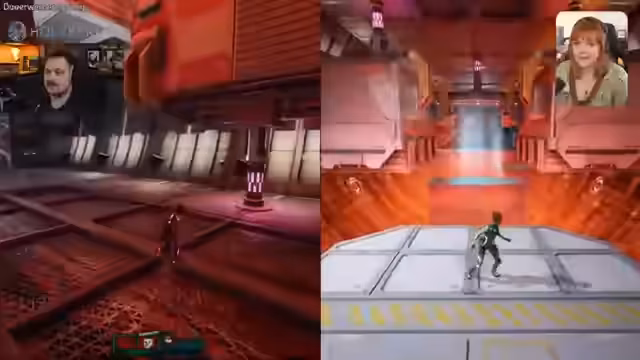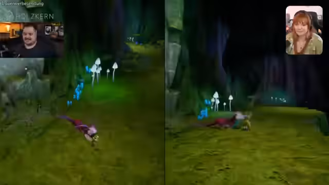 01:03:21Im Spiel angekommen, beginnen Yvraldis und Ranger mit dem kooperativen Gameplay. Sie steuern ihre Charaktere durch eine komplexe Welt, die Elemente aus Crash Bandicoot, Fantasy und Sci-Fi vereint. Sie navigieren durch gefährliche Passagen, avoidieren Trolle und lösen Rätsel, wobei die Steuerung und die unvorhersehbaren Hindernisse für viel Chaos und humorvolle Momente sorgen.