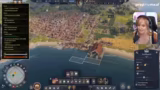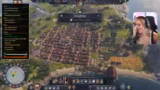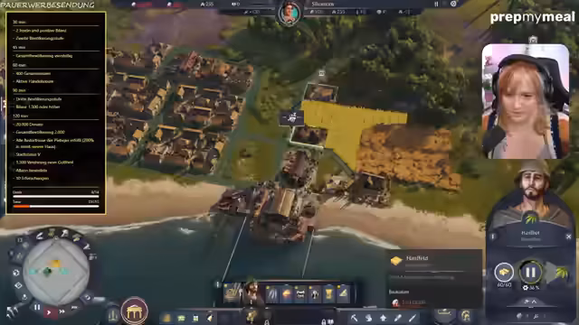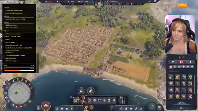 00:42:05Der Streamer gibt detaillierte Anweisungen zur Stadtplanung: Es werden Holzfäller und Sägewerke errichtet, um Baumaterial zu produzieren, und Wohnhäuser für die erste Bevölkerungsstufe, die „Liberties“, gebaut. Diese benötigen Lebensmittel wie Sardinen und Haferbrei, weshalb entsprechende Produktionsgebäude direkt am Strand und an Feldern entstehen. Der Aufstieg in die nächste Bevölkerungsstufe erfordert Märkte und Tavernen, um die Einkommen und Zufriedenheit zu steigern. Gleichzeitig gerät das gesamte Projekt in eine schwere finanzielle Krise, da die Ausgaben die Einnahmen übersteigen und das Konto bis auf -11.000 Denare sinkt.