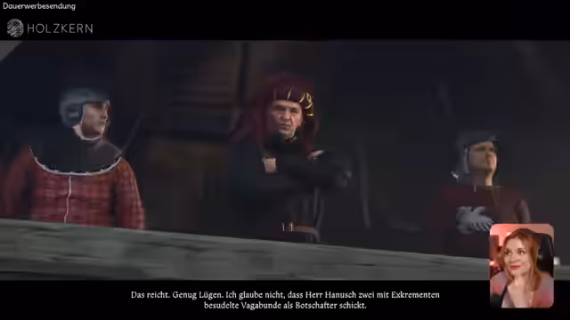 05:35:53Die Streamerin berichtet von ihren Erlebnissen auf der Gamescom, wo sie das Spiel anspielen durfte und ein Mousepad von King'n'Comp erhielt. Sie erzählt von einem gemütlichen Bierchen mit Tobi von King'n'Comp nach Messeschluss in den "geheimen Archiven". In der Spielhandlung wird die Figur von einer alten Frau aufgepäppelt, aber sie glaubt nicht, dass Kräuter wirklich helfen. Sie freut sich auf ein vernünftiges Bett und etwas Wein in der Burg. Die Figur wird mit Exkrementen beworfen und gibt vor, ein Bote des Herrn Hanusch von Laipa zu sein, wird aber nicht ernst genommen und als Lügner entlarvt. Die Streamerin bedankt sich für einen Raid und freut sich über die Unterstützung. Sie erwähnt, dass sie gerade erst mit Kingdom Come Deliverance angefangen hat und ultra happy ist. Die Streamerin entschuldigt sich für die Werbung, die sie nicht verhindern kann. Sie empfiehlt den Kanal SEMA für Zuschauer, die jemanden suchen, der Spiele auf 100% durchspielt. Die Streamerin plant, noch ungefähr eine Stunde zu streamen und fragt sich, wie sie aus der Misere herauskommen soll.