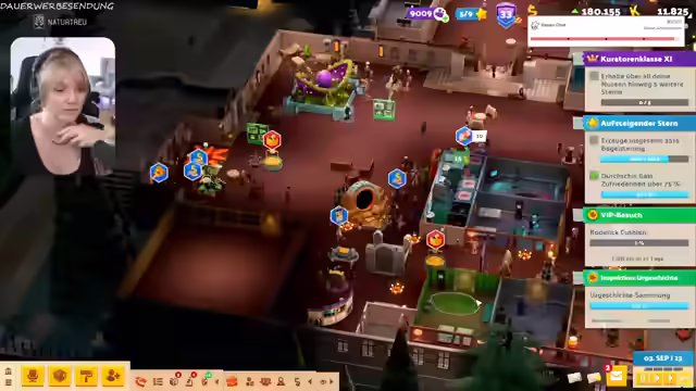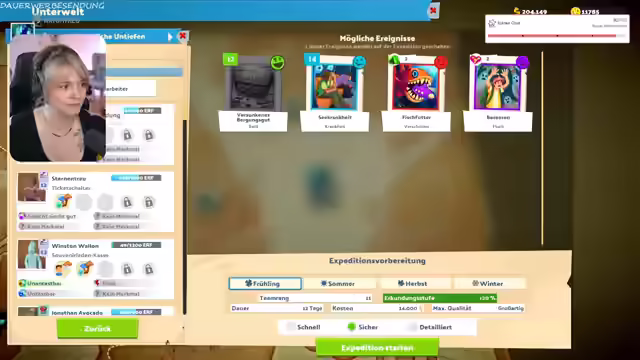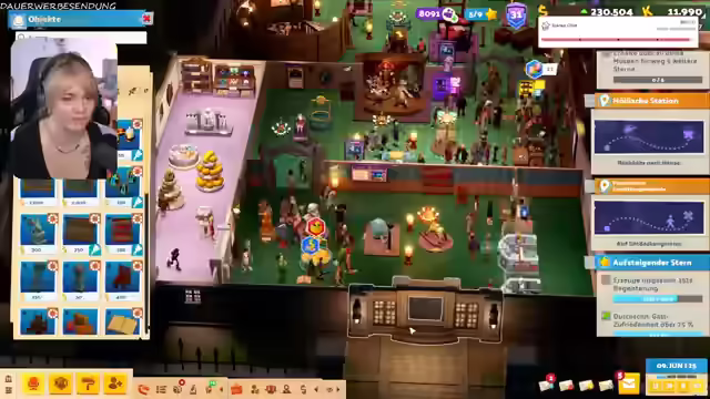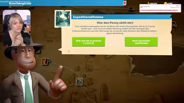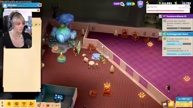 02:14:08Es werden Mitarbeiter auf Expeditionen geschickt, um den Assistenten William Wellington zu leveln und bessere Items zu erhalten. Die Streamerin spricht über die Notwendigkeit, einen Regenschirm zur Polaris mitzunehmen, da das Wetter unbeständig sein könnte. Es wird humorvoll über die Two-Point-Sucht gesprochen und die Beteuerungen, jederzeit aufhören zu können. Die Mitarbeiter erhalten eine Gehaltserhöhung von 3%, nachdem die Streamerin sie erst dazu auffordern musste. Es wird über die Vorbereitung auf die Polaris gesprochen, einschließlich Outfitplanung und die Organisation des Stands. Es wird erwähnt, dass es auf der Polaris ein kleines Atelier geben wird, wo man die Sachen der Streamerin bekommen kann. Es wird überlegt, ob ein Klo im Museum überbewertet ist. Es wird über ein Dilemma im Spiel diskutiert, bei dem ein Gespenst das Team belästigt und versucht, ein Exponat zu stehlen. Die Community stimmt dafür, das Gespenst um Hilfe zu bitten, was überraschenderweise zu einer Verbesserung der Exponatqualität führt.