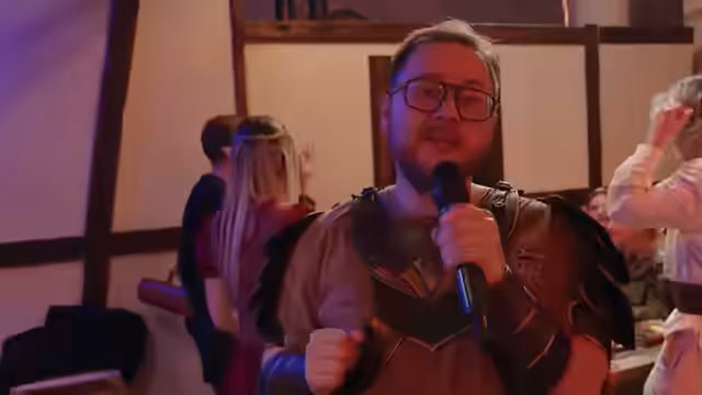 00:14:24Tom Ferenc, Synchronsprecher und Content Creator, stellt sich vor und erläutert seine Rolle als Spieler in der bevorstehenden Impro-Live-Action-Rollenspiel-Runde. Er ist bekannt als die Stimme von Will Byers aus Stranger Things und Grover aus Percy Jackson. Er erklärt, dass das Event eine Kampagne mit vielen talentierten Leuten ist und dass zehn Kameras und 13 Mikrofone im Einsatz sind, um das komplett gebaute Set und die Halle einzufangen. Die Zuschauer werden darüber informiert, dass das Spiel komplett improvisiert ist und 13 NPCs in der Taverne zur Interaktion bereitstehen. Die drei Spieler, Vera, Kaya und Tom, haben sich eigene Rollen und Kostüme ausgedacht. Der Start des Events wird gegen 17:40 oder 17:50 Uhr erwartet, da die Organisation sehr aufwendig ist. Es wird hervorgehoben, dass das Event eine lange Vorbereitungszeit hatte und viele Menschen im Hintergrund daran arbeiten.