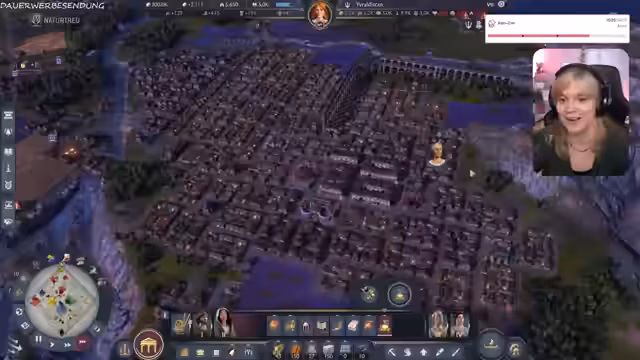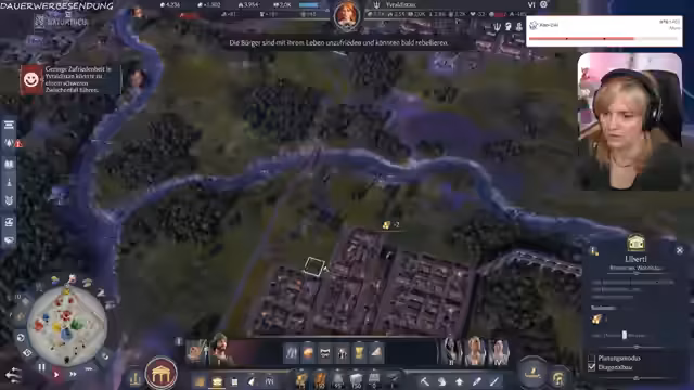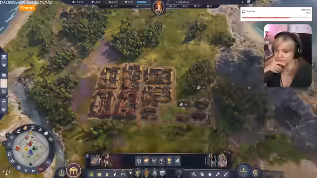 03:04:53Die Streamerin und die Community haben es geschafft, die Tausender-Marke im Hype Train zu überschreiten, was als Wahnsinn bezeichnet wird. Währenddessen wird die Krise im Spiel langsam in den Griff bekommen. Die Produktion von Brei wird wieder aufgenommen, um die Einwohnerzahl zu stabilisieren. Sobald dies geschehen ist, soll die Waffenproduktion gestartet werden, um die Handelsrouten wiederherzustellen, da das Fehlen von Bedürfnissen zu einer fatalen Kettenreaktion führen könnte. Die Brandursache ist wieder extrem hochgeschnellt, was auf anhaltende Probleme hindeutet. Es wird überlegt, ob die Inseln größer wirken als in Anno 1800. Die Streamerin befürchtet, dass der Bau des Amphitheaters ein Fehler war und überlegt sogar, neu anzufangen, da die aktuelle Situation sehr negativ ist. Sie erwähnt, dass sie eine Villa besitzt, die sie einsetzen könnte, um die Zufriedenheit zu steigern.