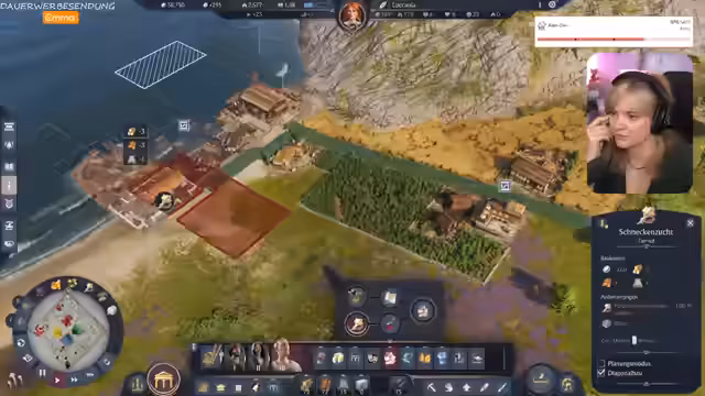 01:14:10Die Streamerin identifiziert und behebt mehrere Produktionsengpässe in ihrem Spiel. Zunächst stellt sie fest, dass trotz vorhandener Materialien der Winzer für die Weinproduktion fehlt, was umgehend korrigiert wird. Des Weiteren wird die Notwendigkeit einer weiteren Insel für den Abbau von Mineralien und Flachs erkannt. Die letzte Insel kostete 20.000, und die Streamerin befürchtet, dass die nächste Insel, die den Namen Raccoon City erhält, möglicherweise 40.000 oder sogar 65.000 kosten könnte. Eine weitere Insel, auf der Flachs angebaut wird, soll vom Chat benannt werden, wobei Vorschläge wie Toskana oder Ollihausen gemacht werden. Die Streamerin erwähnt, dass sie keine Oliven mag, aber für ihre Community Oliven anbauen würde, um Olivenöl herzustellen, da dies für zukünftige Produktionen wichtig sein könnte. Sie plant, eine Handelsroute für Oliven einzurichten und fragt nach einem Namen für das neue Schiff, wobei Vorschläge wie MS Blub oder Olympic-Schwester der Titanic diskutiert werden.