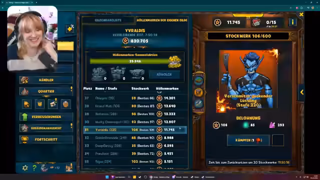 03:07:47Der Stream geht mit dem Spielen von Shakes & Fidget weiter, wobei die täglichen Aufgaben (Dailies) im Vordergrund stehen. Die Streamerin, auf Level 235, bietet an, Fragen zum Spiel zu beantworten. Sie erklärt die Funktionsweise von Pets, die gesammelt und gelevelt werden können, und wie man sie im Kampf einsetzt. Es werden Dungeons wie das Dämonenportal und die Lichtwelt-Dungeons durchgespielt, wobei die Streamerin ihren Fortschritt und die Herausforderungen der verschiedenen Level erläutert. Sie erwähnt, dass sie an ihre Grenzen im Märchenturm gestoßen ist und nun andere Dungeons erkundet. Die Gildenaktivitäten, einschließlich Gildenangriffen und dem Gildenportal, werden gezeigt. Die Streamerin levelt ihren Charakter, indem sie Intelligenz und Ausdauer pusht, ihre Hauptattribute als Magierin. Anschließend wird der Elevator-Event vorgestellt, ein monatliches Event, bei dem Gildenmitglieder gemeinsam Etagen erklimmen, um Belohnungen zu erhalten. Die Streamerin kämpft sich durch die Etagen, wobei sie die Herausforderungen und Belohnungen des Events beschreibt. Sie lädt einen Zuschauer in die Gilde ein, nachdem ein inaktives Mitglied entfernt wurde, und erklärt, wie man Codes für Belohnungen im Spiel einlösen kann. Abschließend werden weitere Dailies erledigt und die Pets gefüttert, bevor der Stream zum Backen übergeht.