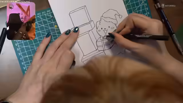 02:04:29Der Malprozess der Weihnachtskarte mit den neuen Pastellmarkern wird demonstriert. Wichtige Techniken werden erklärt: Schnelles Arbeiten mit feuchter Tinte für gleichmäßige Flächen, Schattieren durch Auftragen derselben Farbe in Schichten und Wechsel zu dunkleren Tönen für Übergänge. Die Marker werden für das Weiß der Plüschmütze genutzt, um subtile Schatten zu setzen. Hervorgehoben wird die hohe Qualität der Marker trotz des günstigen Preises, verglichen mit teuren Marken wie Copic. Probleme sind die geringe Farbintensität bei Pastelltönen und das Fehlen einzelner Nachkaufmöglichkeiten, was bei häufig genutzten Farben (z.B. der Waschbärenfarbe) als Nachteil beschrieben wird.