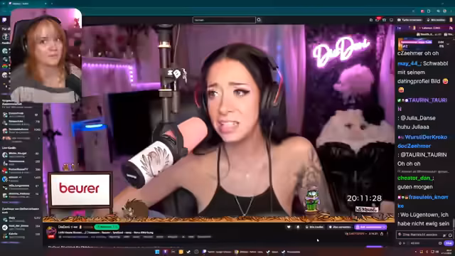 00:32:55Die Streamerin äußert ihre Nervosität bezüglich der bevorstehenden Anno Challenge am nächsten Tag, bei der sie Merle Perle und Melonie Anno beibringen muss, das Spiel innerhalb von zwei Stunden zu spielen und dabei Challenges zu meistern. Sie plant, sich am Morgen mit Kaffee und Notizen vorzubereiten, um so viele 'Korts' wie möglich für die Zuschauer zu gewinnen. Später im Stream spielt sie mit Doni Akinator, um herauszufinden, ob sie und Schwabbel im Spiel gelistet sind. Es stellt sich heraus, dass die Streamerin bereits im Akinator-Spiel vorhanden ist und 77 Mal gespielt wurde, was sie sehr stolz macht. Anschließend versuchen sie, Schwabbel im Akinator zu finden, was ebenfalls gelingt. Schwabbel wird 614 Mal gespielt und enthüllt dabei humorvoll einige 'krumme Dinger' aus seiner Vergangenheit, wie das Vergessen der TÜV-Erneuerung und das Verstecken seines Autos vor der Polizei.