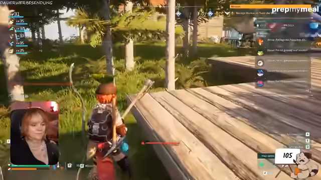 00:29:23Die Streamerin widmet sich dem Ausbau ihrer Basis im Spiel. Sie zeigt den Steinbruch und die Holzfällerstation, deren Erneuerung 13 Tage dauert. Anschließend erkundet sie die Welt, um Gegenstände und Tiere für ihre Sammlung zu finden. Ein Hauptaugenmerk liegt auf dem sogenannten Schönbauen, bei dem sie versucht, ihre Basis dekorativ zu gestalten, was sie als anstrengend, aber auch als positiven Vibe beschreibt.
