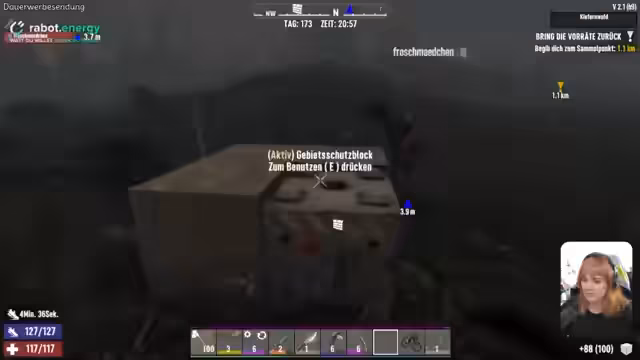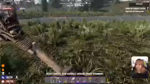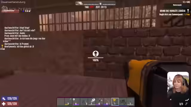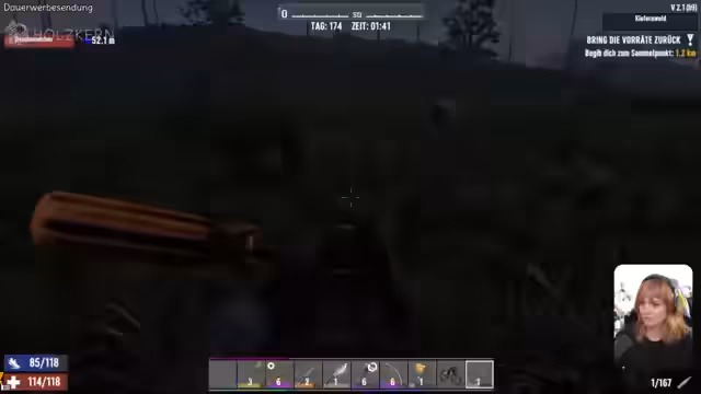 01:17:14Die Streamerin wird während der Holzsammlung von einem Zombie infiziert und ist mit dieser unangenehmen Situation konfrontiert. Trotzdem bleibt sie bei der Sache und verteidigt sich erfolgreich gegen Angreifer. Sie sammelt dringend benötigte Ressourcen wie Honig, verteilt Nahrung an Nele und wechselt zwischen dem Bau der Basis, der Verteidigung und dem Sammeln von Materialien, während sie sich auch mit dem plötzlichen Wetterwechsel, einem Gewitter, arrangieren muss.