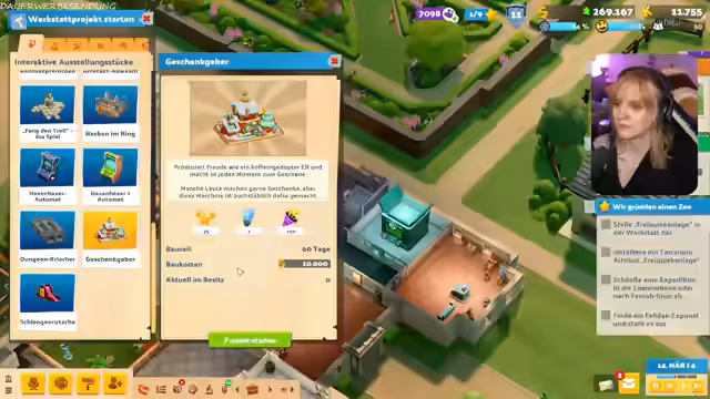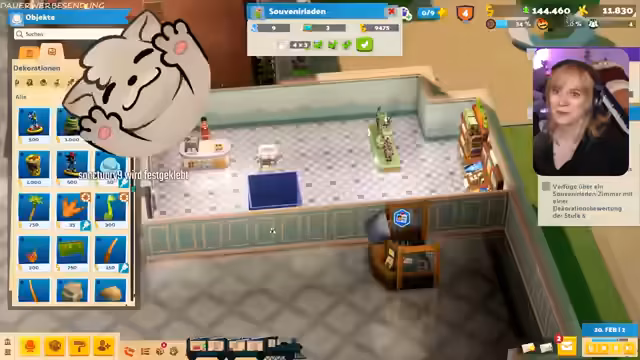 00:56:19Nach der erfolgreichen Ansiedlung des ersten Tieres konzentriert sich der Stream auf die Gestaltung der Museumsräume. Es werden neue Dekorations- und Bodenoptionen wie Pixelböden und spezielle Tapeten freigeschaltet und verbaut, um den Räumen eine ansprechendere und thematischere Atmosphäre zu verleihen. Gleichzeitig wird der Souvenirladen geplant und der Bereich um den Ticketschalter erweitert, um die steigende Besucherzahl bewältigen zu können.