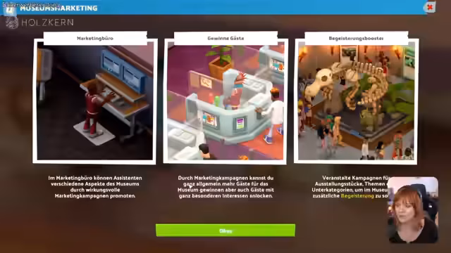 04:58:41Nach dem Erreichen des Wasserventils stellt sich heraus, dass die Oase durch die Beseitigung der Birnen nicht aufgewertet wurde, sondern im Gegenteil schlimmer aussieht. Um den Schaden für den Museums-Bandal zu begrenzen, wird ein Booster-Box aufgestellt, um die negative Presse zu kompensieren. Die nächste große Aufgabe ist die Organisation der Pop-Up-Ausstellung "Ferner Fels", die spezielle Marketingmaßnahmen erfordert. Ein Marketingbüro wird gebaut und mit Assistenten besetzt, um zielgerichtete Kampagnen für verschiedene Themen und Exponate durchzuführen und so Gäste anzulocken.