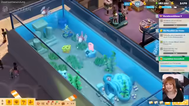 05:42:58Nachdem der erste Fisch gezüchtet wurde, konzentriert sich das Spiel auf die erfolgreiche Fischzucht. Der Streamer erklärt, dass Fische sich nur bei maximaler Zufriedenheit vermehren, und berichtet über den schnellen Erfolg bei der Nachzucht. Parallel wird das Museum durch den Kauf eines neuen Grundstücks erweitert, was den Aufbau eines separaten Eingangsbereichs ermöglicht und dem Ziel dient, das Museum durchzuarbeiten und schließlich ein normales Museum aufzubauen.
