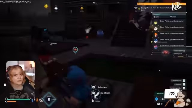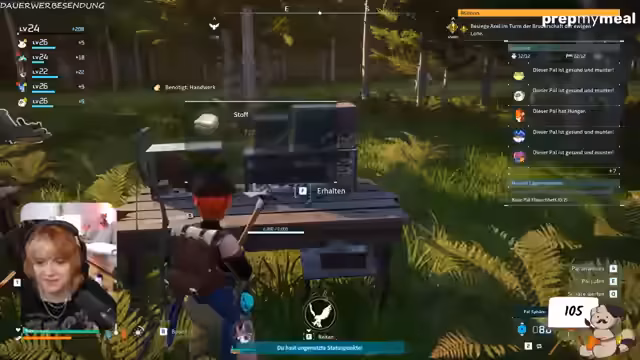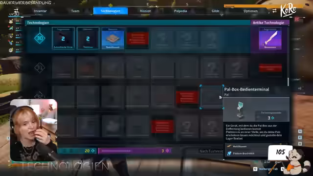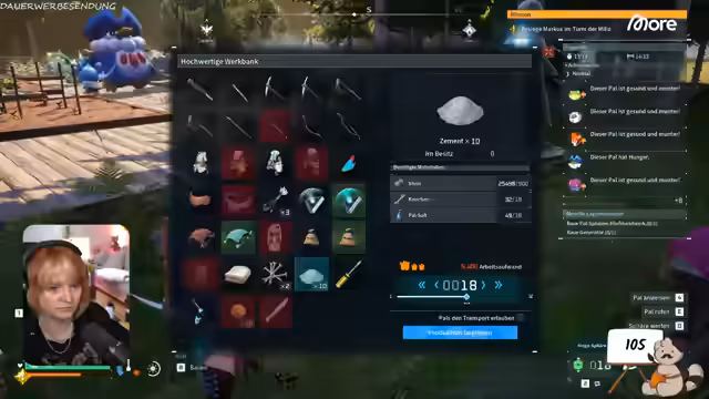 01:45:11Das Gameplay konzentriert sich auf das strategische Management von Ressourcen. So werden wertvolle Materialien wie Gummuslaub für die Verstärkung von Frau Stern gesammelt und Polzops gefangen, um deren Nutzen zu maximieren. Parallel dazu werden die Pauls (Tiere) betreut: Futter wird ausgelegt und der Futterbeutel aufgewertet. Die Fertigung von Arznei und die Notwendigkeit von Metall für zukünftige Projekte werden diskutiert, ebenso die Produktion von Stoff durch eine Wolle-Farm, um ein weiteres Paul-Bett zu bauen.