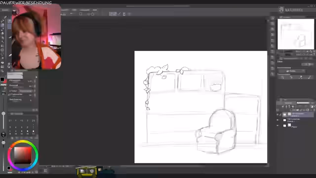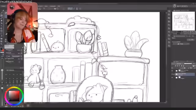 02:40:45Die Diskussion um Grafiktabletts wird fortgesetzt. Die Streamerin erklärt, warum sie sich für ein teureres Wacom-Gerät entschieden hat, obwohl XP-Pen preiswerter ist. Für sie ist die Geschwindigkeit und Präzision bei der Feinarbeit entscheidend. Sie arbeitet nun an der finalen Ausarbeitung eines Bildes und gibt Einblicke in ihren kreativen Prozess. Das Motiv umfasst ein Bücherregal mit vielen Details wie Pflanzen, Figuren, Lampen und sogar einem Fuchs, der auf der Wolle spielt. Sie plant, die Outlines in den nächsten Stunden fertigzustellen und ist von der Motivation des Chats angetrieben.
