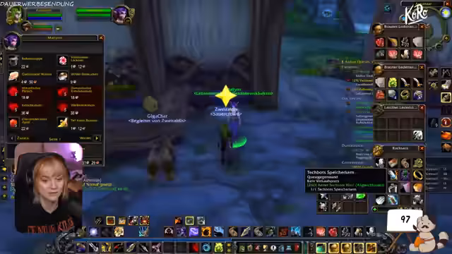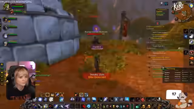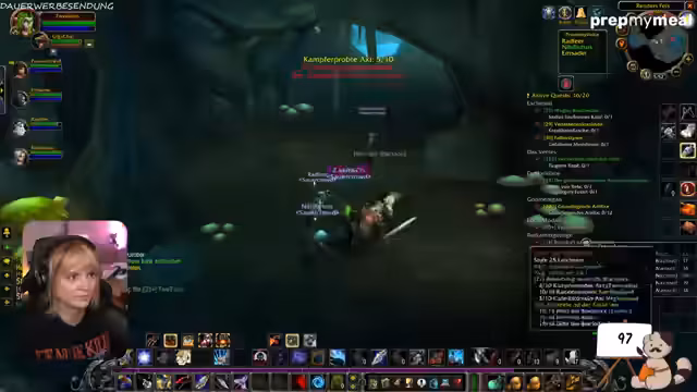 01:37:57Der Streamer erkundet die Rotkammpassagen, auf der Suche nach einer speziellen Elite-Quest. Nach anfänglichen Schwierigkeiten mit der Navigation und dem Kampf gegen mehrere Gegner gleichzeitig, findet der Weg zur richtigen Questgeberin. Die Stimmung ist geprägt von Konzentration und der Sorge, versehentlich zu viele Gegner anzuziehen. Trotz eines Todes und einer verbuggt Quest, die neu angenommen werden muss, wird das Ziel erreicht und die Quest angenommen. Der Fokus liegt auf dem Sammeln von Questgegenständen und dem vorsichtigen Vorgehen im Gebiet.