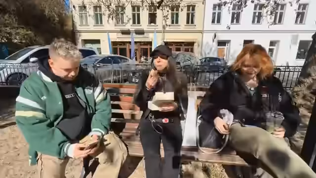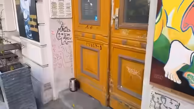 00:09:54Die Gruppe beschließt, die Auguststraße hinunterzugehen und in die berühmten Hackeschen Höfe einzutauchen. Sie bewegen sich langsam durch die belebte Ecke, um die vielen kleinen Läden für Krimskrams, Klamotten und Secondhand-Waren zu erkunden. Auf ihrem Weg stoßen sie auf zahlreiche historische und künstlerische Motive, darunter bemalte Türen, Graffiti und eine Kirche mit Einschusslöcher an der Fassade, die als typisch für Berlin angesehen werden.