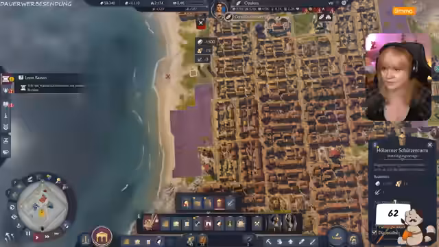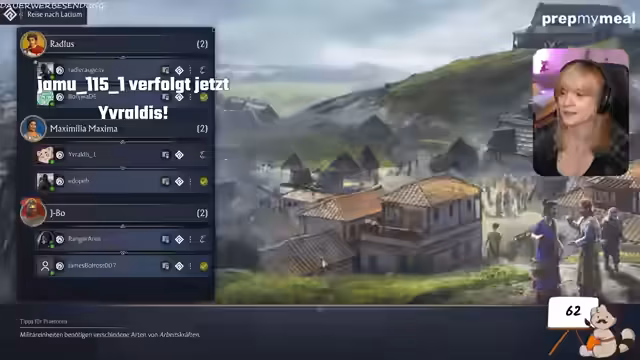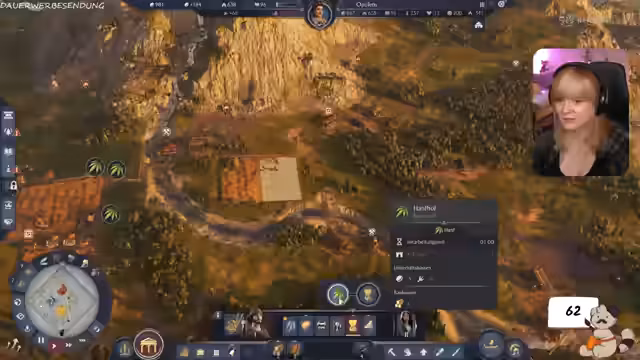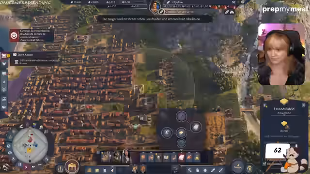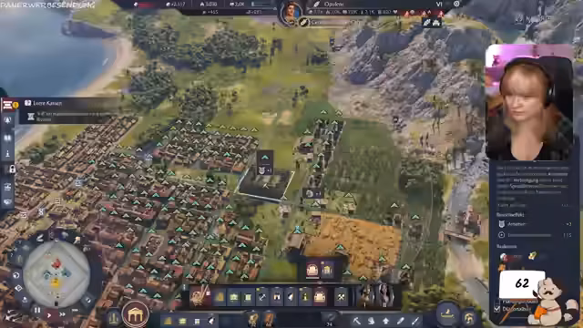 03:18:20Das Team manövriert politisch zwischen Verbündeten und Gegnern, darunter Ranger und Hanno, wobei Vorwürfe des Verrats (besonders gegen Hanno) im Raum stehen. Strategisch werden Joker (z.B. Baustopp) eingesetzt, um Angriffe zu stoppen. Parallelaufbau von Forschung (Wissen) und religiösen Gebäuden soll das zweite Siegesattribut stärken, während die Einwohnerzahl auf 9.100 steigt.
