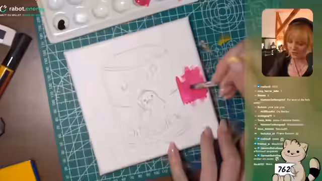 02:28:32Der Fokus liegt auf dem Live-Malen, bei dem ein Bild mit dem Titel 'Allesamt Suppe' entsteht. Nachdem der Umriss übertragen wurde, diskutiert die Streamerin die Farbpalette mit dem Chat. Es geht darum, die richtige Hintergrundfarbe für das Side-Chick-Motiv zu wählen. Die Zuschauer haben per Abstimmung zwischen Blau und Pink entschieden, und der Malprozess wird live begleitet, wobei die Deckkraft der Gouache-Farben gelobt wird, auch wenn gelegentlich die Wasserverhältnisse angepasst werden müssen.