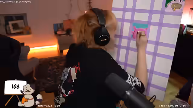 01:15:17Die Streamerin arbeitet an einem Kunstprojekt, das aus vielen kleinen Leinwänden besteht, die zu einem großen Ganzen zusammengefügt werden. Die Maße sind alle 10 x 10 cm. Sie beschreibt ihren Stil als comichaft, süß und niedlich, den sie zwar liebt, bei dem sie aber auch mit Rückschlägen zu kämpfen hat. Neben dem aktuellen Projekt malt sie auch an einer größeren Leinwand, um ihren Stil weiterzuentwickeln. Sie experimentiert mit Acrylfarben und -stiften und mischt ihre Farben selbst, was sie als schwierig, aber erlernbar bezeichnet.