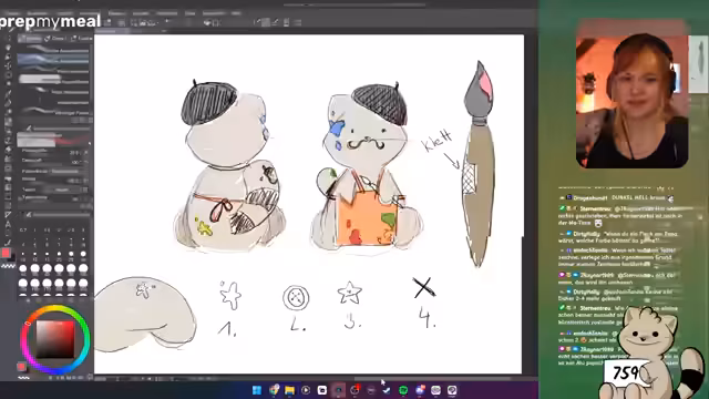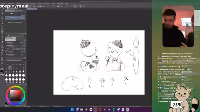 01:50:02Der Streamer lädt die Community ein, gemeinsam an der Gestaltung eines zweiten Plüschtiers zu arbeiten. Er schlägt verschiedene Ideen vor wie eine Bob Ross-ähnliche Figur mit Perücke und Pinsel oder eine Figur mit Farbklecksen. Nach Diskussionen über Details wie Kleidungsstücke (Schürze, Hemd, Barett) und Accessoires entscheidet er, dass das Plüschtier wahrscheinlich eine Schürze tragen soll. Er plant, die Entwürfe bis Ende April zu finalisieren, um einen Prototyp herstellen zu lassen.