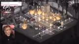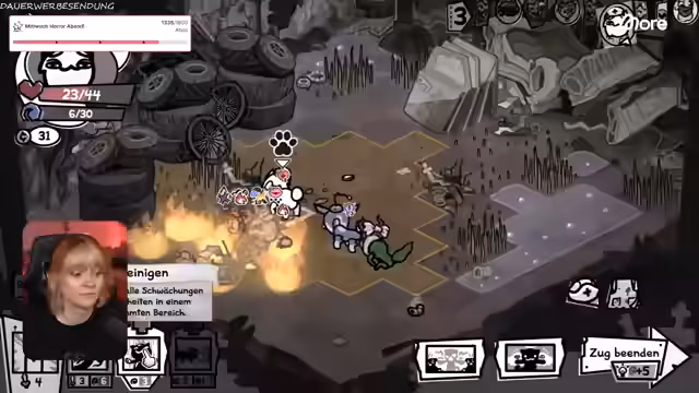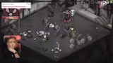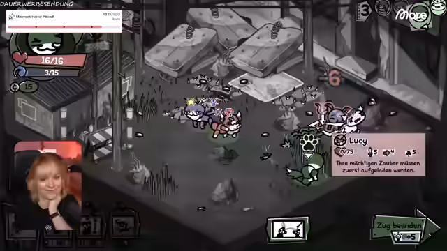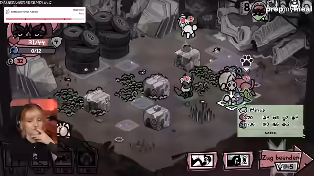 01:44:56Im Spiel kämpft der Streamer gegen eine Bombe in Dornen, die großen Schaden anrichtet. Die Strategie ist, die Bomben zu zerstören, bevor sie explodieren, während die kleineren Katzen nicht als Hilfstruppen agieren. Der Kampf ist sehr schwierig und heikel, da eine falsche Bewegung zur Explosion führen kann. Es herrscht eine angespannte Atmosphäre, da die Gesundheit der eigenen Truppe stark abnimmt und die Bombe nicht anvisiert wird.
