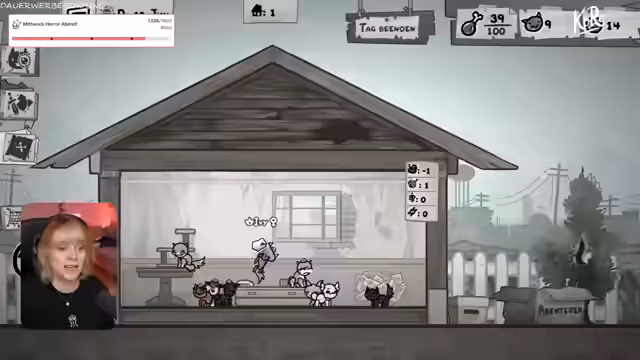 01:16:55Bei der Rückkehr zum Katzenhaus wird die Geschichte von 'Frank' erzählt, einer Gruppe von unter dem Haus lebenden Katzen, die das Haus bauen und erweitern. Sie nehmen nur Katzen im Ruhestand auf. Streamer nimmt einen weiteren Streuner auf, der daraufhin erwachsen wird. Es folgt die Vorbereitung für ein weiteres Abenteuer, bei dem die Katzengruppe mit neuen Fähigkeiten ausgestattet wird.