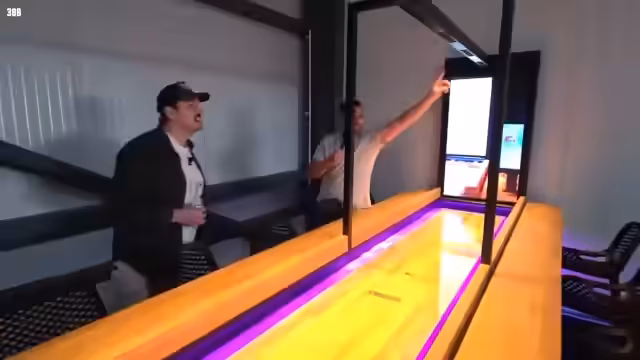 01:06:18Eine Kooperation mit einem Balanceboard-Hersteller wird vorgestellt, passend zum Thema Balance halten. Die Boards sind in verschiedenen Designs und Schwierigkeitsgraden erhältlich und sollen gut für den Beckenboden sein und Spaß machen. Es gibt einen interaktiven Shuffleboard-Tisch, der durch eine Kooperation ermöglicht wurde. Der Tisch verfügt über eine Kamera, die die Position der Spielpucks mit Barcodes erfasst und auf einem Display anzeigt. Dadurch können verschiedene Spiele mit bis zu zehn Personen gespielt werden, was ideal für Geburtstags- oder Firmenfeiern ist. Der Streamer freut sich sehr über den Tisch und betont, dass er alles dokumentiert und festgehalten hat, da er die Eröffnung seit drei Jahren plant. Die Gastrofläche bietet Bereiche für größere Gruppen und Familien, während das Herzstück die größte Flowboard-Anlage Europas ist.