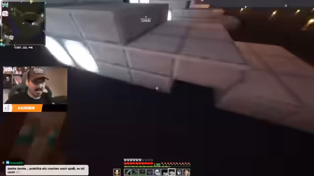 02:49:59Zander befindet sich im Bau einer riesigen Tintenfischfarm, die er nach unten an einem Ort errichtet hat, den andere Spieler bereits als verlassen markiert haben. Er erwähnt, dass das Projekt sehr groß ist und er Schwierigkeiten hat, bestimmte Ressourcen wie Seelaternen in ausreichender Menge zu finden. Während des Streams entdeckt er ein gespawntes Kamel, das er süß findet, aber nicht als Begleiter mitnehmen kann. Er plant, die Farm effizient zu gestalten und die gewonnene Farbe für ein großes Projekt, einen Hangar, zu verwenden.