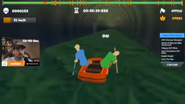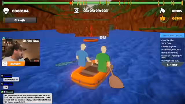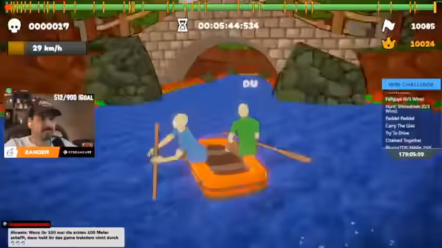 01:50:55Nach dem anstrengenden und frustrierenden Ende von Sea of Thieves, bei dem das eigene Schiff mit einer wichtigen Flagge verloren ging, wechseln die Streamer zu dem angekündigten Spiel Paddelpaddel. Das Spiel stellt sich als sehr herausfordernd und nervenraubend heraus, da es exakte Synchronisation und schnelle Reaktionen erfordert. Die Streamer geraten wiederholt in Rage, da sie ständig an denselben Hindernissen scheitern und Fehler machen, was zu humorvollen, aber auch wütenden Reaktionen führt.