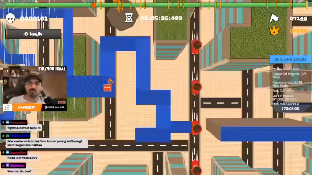 03:35:08Auf dem letzten Abschnitt des Levels orientieren sich die Streamer an den Gebäuden auf dem Bildschirm, um den Weg zum Ziel zu finden. Sie müssen eine Abfolge von Sprüngen und Richtungswechseln meistern, wobei ständig die Gefahr besteht, gegen Wände oder Hindernisse zu prallen. Die Orientierung geht verloren und der Versuch, den letzten Marker zu erreichen, scheitert mehrmals, was zu einer Mischung aus Humor und Frustration führt, da sie immer knapp am Ziel vorbeifahren.