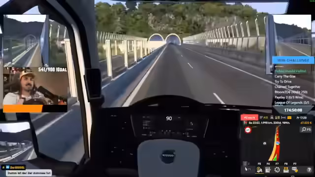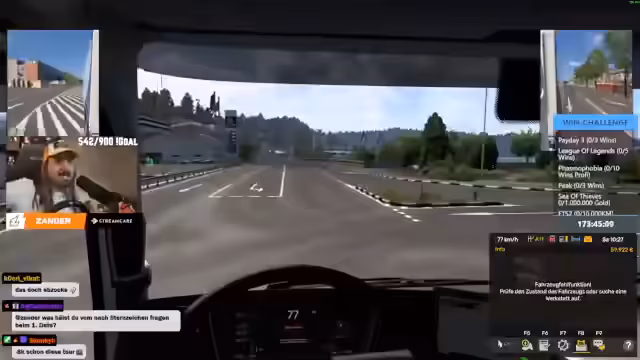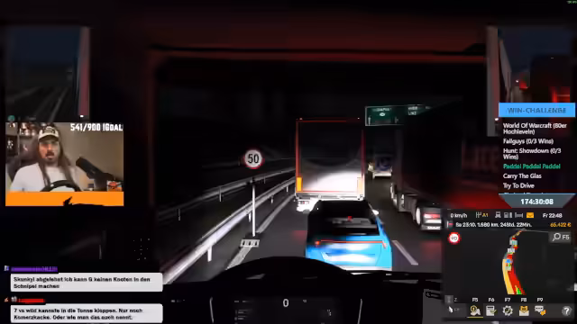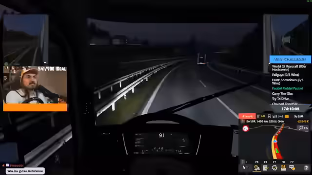 06:30:43Während der Fahrt treten mehrere technische und spielerische Herausforderungen auf. Das Lenkrad funktioniert nicht richtig, was auf Kalibrierungsprobleme zurückzuführen ist. Die Konfiguration der Steuerung wird überprüft. Zudem beschwert sich der Streamer, dass sein LKW ständig rückwärts fährt, obwohl er die Bremse nicht betätigt. Die Fahrt wird jedoch fortgesetzt, wobei beide Teilnehmer über Funk kommunizieren und über Themen wie Trucker-Lifestyle, Essen und den weiteren Verlauf der Challenge sprechen.