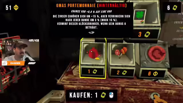 00:50:17Nach dem erfolgreichen Abschluss einer Deadline wird entschieden, weiterzuspielen, wobei eine Schublade als Belohnung erhalten wird. Es werden verschiedene Strategien in Betracht gezogen, darunter die Erhöhung des Werts von Mustern mit drei oder weniger Symbolen. Das Spiel wird als Roguelite beschrieben, bei dem Schulden abbezahlt und Glücksbringer eingesetzt werden müssen, um Werte zu erhöhen. Es wird betont, dass man trotz des Glücksspiels am Ende meistens verliert. Die 7 wird in die Schublade gelegt und ein Item ausgelöst, das Glück für den aktuellen Spin gewährt. Es wird bedauert, nicht eingezahlt zu haben, da die goldene 7 weggelegt wurde. Die nächste Deadline erfordert 33.000 Credits. Ein Item wird entdeckt, das Glück für den letzten Spin einer Runde gewährt, sowie einen zusätzlichen Spin und Glück für jeden Spin danach. Die Zinsen werden auf 15% erhöht. Es wird überlegt, das Megafon zu kaufen, das alle Telefonfähigkeiten ein weiteres Mal auslöst. Die Zinsen werden nun beim Automaten ausgezahlt. Es wird erneut das Problem mit dem Muster 666 erwähnt. Das Telefon bietet verschiedene Optionen, wie kostenlose Glücksbringer oder die Verdopplung von Klee-Tickets. Es wird beschlossen, die Münzen auf 0 zu setzen und dafür 6 Glückstickets zu erhalten. Ein Atomknopf-Item wird gekauft, das alle vom roten Knopf ausgelösten Glücksbringer ein weiteres Mal auslöst. Es wird überlegt, die Kirschen zu aktivieren, um mehr Muster zu erhalten und somit mehr Zinsen zu generieren. Es wird die 7 rausgeschmissen und das Dämonenhorn genommen. Vor der Deadline wird ein Crazy Win erzielt. Ein Glücksbringerplatz wird erhöht. Es wird ein zusätzlicher Spin als sehr stark eingeschätzt und das Kirschbild weggeworfen, um die Zinsen zu erhöhen. Es wird ein Item entdeckt, das bei drei oder mehr Mustern Geld in Höhe der aktuellen Zinsen gewährt.