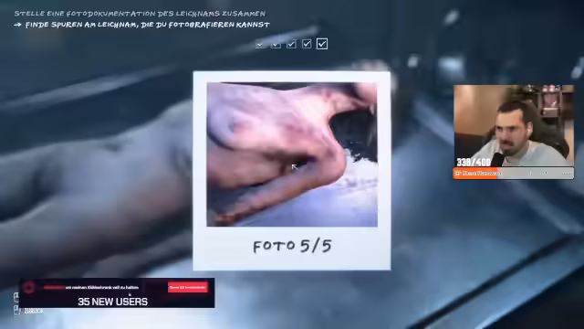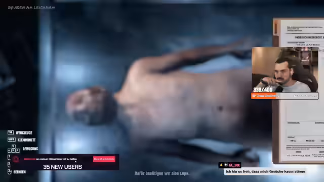 04:43:48Der Stream beginnt mit der Untersuchung einer Leiche, wobei der Streamer zuerst Verletzungen am Hals und Bauch feststellt. Er vermutet mögliche Misshandlungen und versucht, die Todesursache zu klären. Die Fototafel wird mit Beweismaterial bestückt, und die Obduktion beginnt mit der Markierung der gefundenen Stellen. Blaue Flecken und Verletzungen deuten auf einen möglichen Angriff oder einen Erhängungsversuch hin, während Blasen an den Händen auf eine mögliche Vergiftung hindeuten.