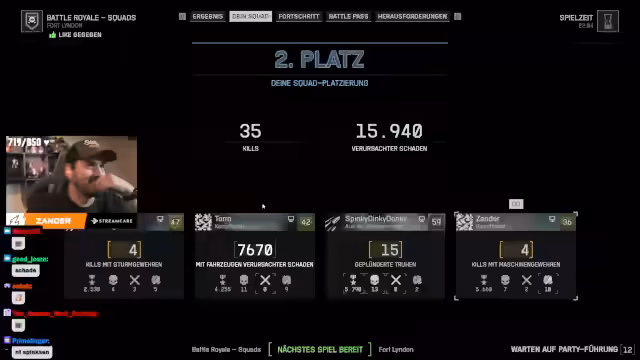 11:33:02Zu Beginn des Streamings wird eine Battle Royale-Runde gestartet, in der der Streamer und sein Team den Leuchtturm als Drop-Ziel wählen. Es kommt zu hitzigen Kämpfen, in denen mehrere Feinde ausgeschaltet werden. Wichtig ist die Ankündigung von Early Kooperationen, die über den Stream hinausgehen. So gibt es Pläne für gemeinsames Zocken im Battlefield-Modus mit Zorro, Spinky und Terste, sowie eine Absprache für einen möglichen gemeinsamen Stream am Folgetag.