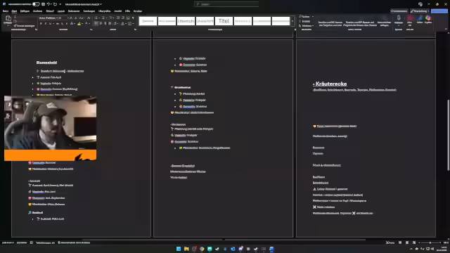 02:43:56Nach einer langen Diskussionsphase legt der Streamer eine detaillierte Liste der Pflanzen fest, die er in seinem Garten anbauen möchte. Dazu gehören vor allem Gemüsesorten wie Erdbeeren, Gurken, Tomaten, Paprika, Möhren, Knoblauch, Kartoffeln, Rote Beete, Wassermelonen und Radieschen, aber auch Beeren wie Brombeeren, Himbeeren und Bananen. Ergänzt wird die Liste durch eine Kräuterecke mit Basilikum, Schnittlauch, Rosmarin, Thymian, Pfefferminz und Fenchel. Entscheidend ist dabei der richtige Standort für jede Pflanze, der meistenorts vollsonnig sein wird.