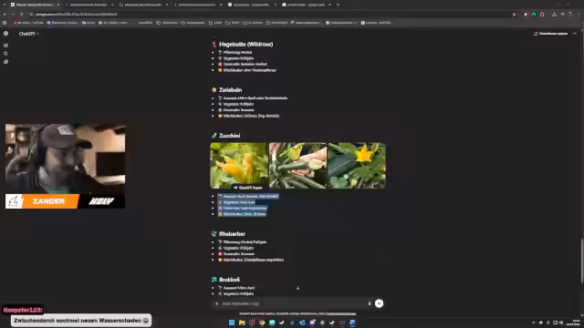 01:15:16Der Streamer definiert Unkraut als jede Pflanze, die unerwünscht in einem Beet ist, da sie Platz, Licht und Nährstoffe stehlen kann oder Krankheiten übertragen. Bei den Erdbeeren stellt er fest, dass die Empfehlung für Knoblauch und Zwiebeln als Pflanzenpartner problematisch sein könnte, da sie den Erdbeeren das Licht nehmen könnten. Stattdessen nennt ChatGPT bessere Partner wie Borretsch, Melisse und Dill, die Befruchter anziehen oder Schädlinge abwehren.
