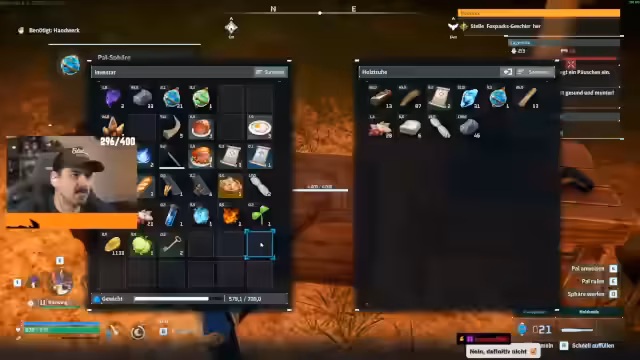 04:25:54Im Gameplay von Palworld kämpft der Streamer mit mehreren Problemen. Sein Bogen geht kaputt, was ihn zu einem Rückteleport zwingt. Er hat Probleme damit, bestimmte Pals zu rufen und zu reiten, und ist bei der Suche nach Feuerdrüsen nicht erfolgreich. Die Befürchtung aufkommt, ein Sattel könnte verloren sein, da das Inventar durcheinanderwirkt.