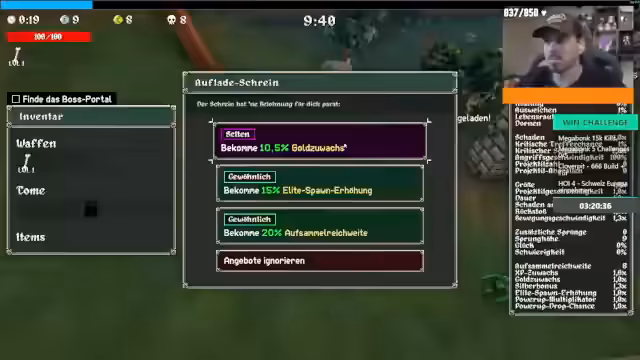 03:16:50Der Streamer startet das Gameplay von Megabonk, um die Solo-Win-Challenge zu beginnen. Er erklärt die Mechaniken des Spiels, wie das Sammeln von Items, die Kombination von Effekten und die Bedeutung von Schwierigkeit und Glück. Während des Gameplays werden verschiedene Strategien besprochen, um die Kill-Ziele zu erreichen, und es werden erste Versuche unternommen, die Challenges zu schaffen. Der Fokus liegt darauf, die richtigen Builds zu finden und die Bosse effizient zu besiegen.