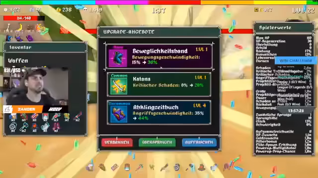 00:07:17Am letzten Tag der Challenge wird Clover Pit gespielt, nachdem die Charaktere bekannt gemacht wurden. Der Fokus liegt auf der Optimierung der Stats, insbesondere durch die Wahl von Max HP, um tanky zu werden, da der Kampf oft Close Combat ist. Ein kritischer Treffer mit 20% Schadensbonus durch den goldenen Ring ist das Ziel, während Bewegungsgeschwindigkeit und Angriffsgeschwindigkeit wichtige Stats sind. Mit drei Tassen Kaffee im System wird die Runde strategisch geplant, wobei Herausforderungen wie die erste Boss-Begegnung bei zu niedrigem Schaden diskutiert werden. Es geht um den Umgang mit Loot, dem Bau von Stats für kritische Treffer und der Vorbereitung auf weitere Stages.