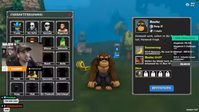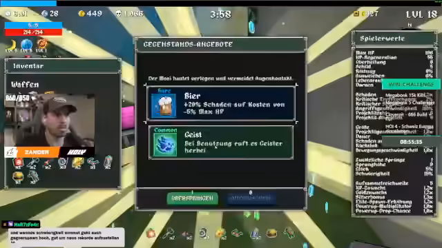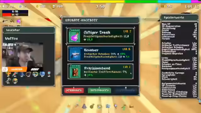 11:55:36Der Stream wechselt zu Megabong, einem neuen Roguelike-Game, das zufällig erscheint. Es werden die Mechaniken erklärt, wie Angeln, Bewaffnung und das Sammeln von Items. Der Streamer zeigt Begeisterung für das Gameplay, betont die verschiedenen Builds und Charaktere, wie den Affen mit Aura oder Calcium, und diskutiert die taktischen Möglichkeiten, etwa durch Erhöhung von Bewegungsgeschwindigkeit oder Schaden.