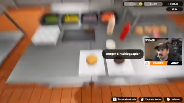 00:37:14Ein kritischer Fehler ereignet sich, als durch den ständig laufenden Grill mehrere Patties verbrennen. Zander, der Koch, kann den Vorgang nicht stoppen, was zu einem erheblichen finanziellen Verlust durch die Entsorgung der verderbten Zutaten führt. Die ersten Kunden werden langfristig unzufriedengestellt. Trotz dieser anfänglichen Probleme kann der Laden Level 2 erreichen, und beide Spieler blicken zuversichtlich in die Zukunft, während sie an der Organisation des täglichen Betriebs arbeiten und auf neue Zutaten für das Restaurant warten.