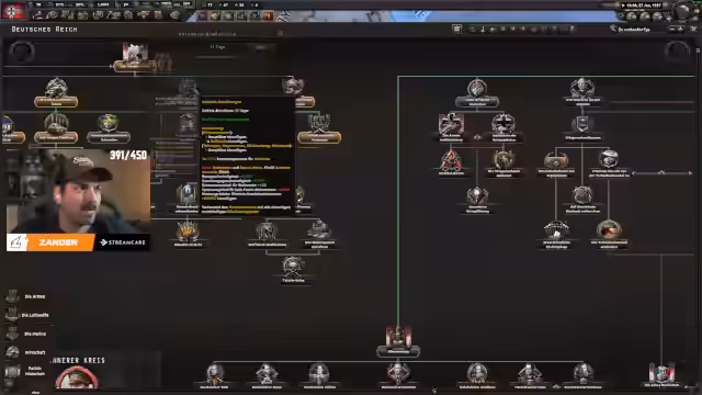 07:07:11Es wird Reichsautobahnen in Erwägung gezogen und die KDF-Wagen als vorteilhaft angesehen, um einen zusätzlichen Forschungsplatz zu erhalten, sobald 50 Zivilfabriken vorhanden sind. Die Ruhrtalsperre wird als stark eingeschätzt, da sie zusätzliche Staatsmodifikatoren für Rheinland-Bauplätze, verfügbare Ressourcen und Baugeschwindigkeit bietet. Es wird diskutiert, ob man sich mit Polen, der Tschechoslowakei, den Sowjets oder Japan anfreunden soll. Die Kriegsschiffe werden eingeholt, und nur noch die U-Boote fahren. Der Nachrichtendienst wird gegründet, und Unterstützung im Tausch gegen Ölfelder von der Sowjetunion wird als vorteilhaft angesehen. Es wird beschlossen, zuerst KDF-Wagen und dann die Ruhrtalsperre zu bauen. In Hannover wird aufgrund der Staatsinfrastruktur ein Multiplikator von zwei beim Bau erreicht. Die Flugzeugproduktion soll gesteigert werden. Funk wird erforscht, und sobald die Wirtschaft fertig ist, soll verteilte Industrie geforscht werden. Es wird darauf hingewiesen, dass zu viel Spionage am Anfang die Produktion schwächen kann. Die Flugzeuge sind alle in Berlin gelandet. Die Marineflieger sollen Richtung Holland und Großbritannien verlegt werden. Ein Agent wird reingeholt, und Wilhelm Canaris wird eingesetzt, um den Nachrichtendienst zu verbessern. Es wird überlegt, ob der klassische Weg über Niederlande, Belgien, Frankreich und Polen gegangen werden soll. Es wird erwartet, dass Belgien von Frankreich und Großbritannien garantiert wird. Es wird beschlossen, zuerst die Niederlande zu holen und dann Tschechoslowakei und Polen zu erobern. Der Standardweg über Anschluss und Sudetenland soll verfolgt werden.