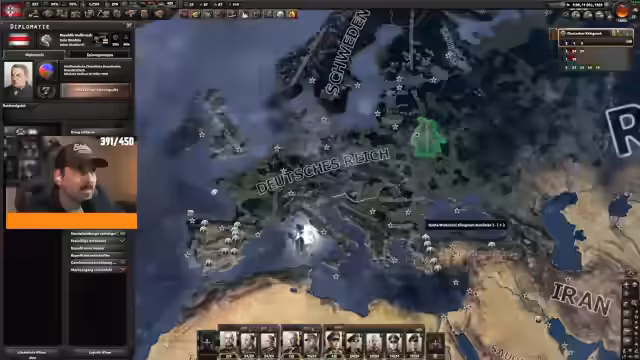 06:39:12Es wird die Idee einer Multiplayer-Koop-Session in Hearts of Iron vorgestellt, bei der eine weitere Person mitspielen kann und jeweils zwei Spieler ein Land besetzen. Dabei sind Allianzen möglich, aber nicht zwingend. Technische Probleme beim Namenswechsel werden diskutiert und gelöst. Die Rollenverteilung wird festgelegt, wobei der Streamer Schweden übernimmt und die Politik gestalten soll. Der Chat wird nach Erfahrungen mit Permabanns aufgrund von Fortnite-Anspielungen befragt. Es wird überlegt, ob Neox mitspielen kann, aber dieser muss seiner Mutter helfen. Die Schwierigkeitsgrade werden festgelegt und die Strategie für den Irak wird besprochen: Zuerst annektieren, dann neutral spielen und später Iran oder die Türkei angreifen, wobei ein Partner für die Wirtschaft benötigt wird. Ein Clip aus einem früheren Marathon wird erwähnt, in dem ein Faschismus verboten wurde. Es wird bedauert, dass nicht drei Zweierteams zustande kommen konnten. Fragen zum Spiel können jederzeit gestellt werden. Einladung für die Italian Tour mit einem pinken Camper wird ausgesprochen. Es wird nach Nerox gefragt, der früher bei Farming Life mitgespielt hat.