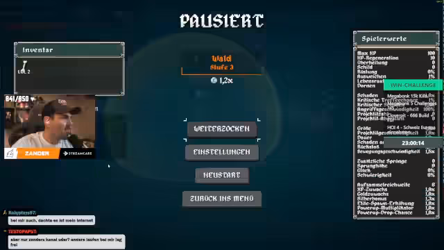 00:15:57Zwischen den Kämpfen wird über Spielmechaniken und Inhalte anderer content creator gesprochen. Der Streamer betont, dass ein erfolgreicher Run stark von einem guten Build und etwas Glück abhängt. Die Vorbereitung auf den Endboss intensiviert sich, wobei Items wie der Ring, der für massiven Schadensboost entscheidend sein kann, sehnlichst erhofft werden. Es wird versucht, eine Balance zwischen Schadenssteigerung und Überlebensfähigkeit (z.B. durch HP-Regeneration) zu finden. Die Schwierigkeit wird auf 25% erhöht, was zu einer erhöhten Gegnerdichte und einem gesteigerten Zeitdruck führt, der eine schnelle Levelsteigerung erforderlich macht.
