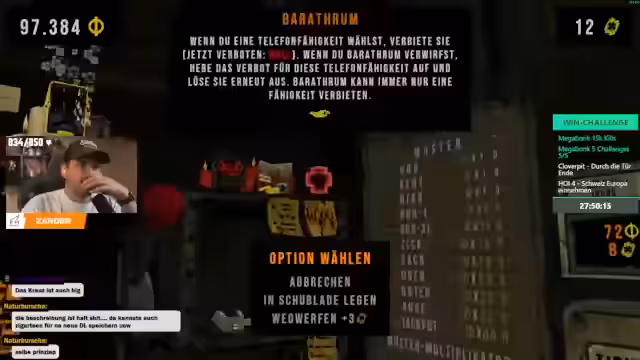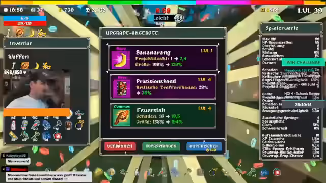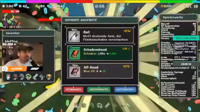 00:06:58Der erste Boss wird bekämpft, wobei die überlebenskritische Item-Auswahl (Schild, Projektilgeschwindigkeit) deutlich wird. Der Streamer analysiert Fehler der Vergangenheit, wie den Verzicht auf das Schadenbuch in früheren Runs. Ein besonderer Fokus liegt auf der Kritischen Trefferchance, die durch Items wie einen speziellen Ring, der den Schaden pro 100 Meter Maximales Leben erhöht, verbessert werden soll. Trotz der anfänglichen Herausforderungen durch starke Gegner und das Risiko, zu schnell zu sterben, wird die Schwierigkeit schrittweise erhöht. Der Run erhält positive Verstärkung durch Items wie das Lagerfeuer, das Lebensregeneration ermöglicht, und den gigantischen Bong, der Gegner mit einem Treffer ausschaltet.