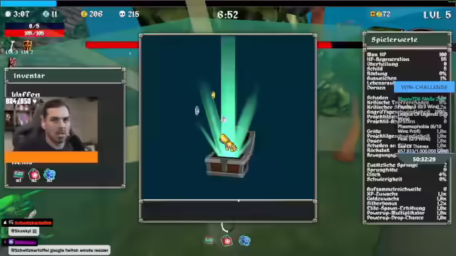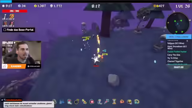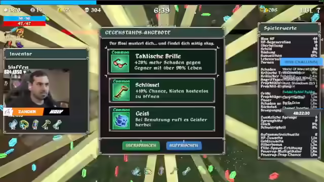 13:06:32Nachdem er viele Items erhalten hat, erhöht der Streamer seinen Schaden und geht auf Leben. Er erhält eine Chance auf Eisschaden bei Treffern und wählt Sprunghöhe. Er lässt Schwerter aus und entdeckt später deren Bedeutung. Die Schwerter bieten eine Chance, One-Hit-Effekte auszulösen. Er nimmt Aura hinzu, was sich jedoch als schlechte Kombination herausstellt. Der Streamer experimentiert mit drei Waffen und erhöht die Projektilanzahl. Er stellt fest, dass die Minimap grün ist und alles voller Items ist. Er entscheidet sich, die Projektilgeschwindigkeit zu erhöhen und nimmt Donnerschlag-Handschuhe. Der Streamer sucht nach dem Boss und erhöht den Schaden der Aura. Er findet den Boss und besiegt ihn schnell. Er erklärt, dass Bücher 99 Mal und Waffen nur 40 Mal verbessert werden können. Er flieht vor einer Situation, in der der Schaden erhöht wird. Der Streamer fährt einmal außen herum, um nichts zu verpassen.