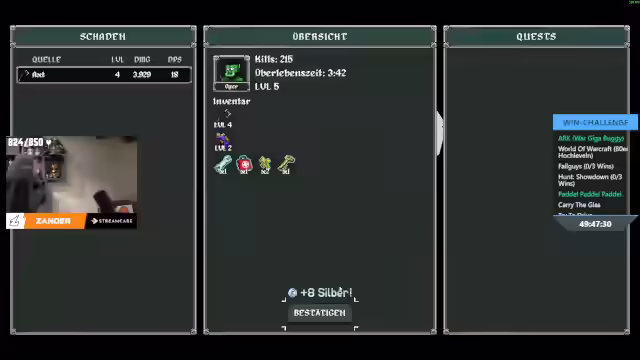 15:02:53Der Streamer findet das Spiel einfach nur gut. Da ist das dritte Radio. Er aktiviert alle Boomboxen im Walsch. Da ist noch ein Magnet. Er nimmt Projektiergeschwindigkeit. Der Streamer nimmt Schaden um 20%. Er stellt fest, dass er immer den Magneten bekommt, wenn der Boss kommt. Er nimmt max AP, damit sind wir auf 200, haben wir 40% mehr Schaden. Elite Spawn bringt mehr Geld. Der Streamer holt sich die Dämonenseele. Er kriegt Leben wieder, wenn er tritt. Er nimmt Schild. Die Bewegungsgeschwindigkeit ist crazy. Er lässt kritische Trefferchance aus. Der Streamer verflucht einen Gegner und fügt ihm jede Sekunde 30% seines maximalen Lebens als Schade zu. Er hat viele Fehler gemacht, aber viel gelernt. Er ist happy damit, dass er noch einen Slot hier frei kriegt. Je länger du stillstehst, desto mehr Schaden. Er vergleicht sich mit anderen Spielern auf dem Leaderboard. Der Streamer findet die Games geil, die momentan rauskommen. Er bedankt sich fürs dabei sein und verabschiedet sich. Er erinnert an seine Socials. Der Streamer geht offline und muss noch Müll rausstellen und mit dem Hund rausgehen.