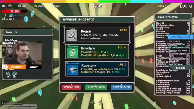 14:17:10Der Streamer erklärt, dass er als Cowboy Gold zu Wachs machen muss. Er wird zusammengeschlagen und versteht nicht, wie der Revolver funktioniert. Er folgert, dass er auf Crit gehen muss, da er 1% kritische Trefferchance pro Level erhält. Er stellt fest, dass er auch etwas Bewegungsgeschwindigkeit benötigt. Der Streamer fragt sich, ob er jedem Schlag ausweicht, wenn er 100% hat. Er lernt, dass er am Anfang daran denken muss, die Items zu ziehen, die er leveln möchte. Er ist enttäuscht von der Map und verklickt sich. Er nimmt eine Projektilanzahl für alle Waffen. Der Streamer nimmt 15% mehr Schaden gegen Elite-Gegner und Bosse. Er erhöht die Angriffsgeschwindigkeit mit drei Waffen. Der Boss geht schnell down. Er nimmt Aufsammelreichweite und Schaden an Elite. Der Streamer levelt den Feuerstab. Er nimmt Geschwindigkeit, kritische Trefferchance und kritischen Schaden.