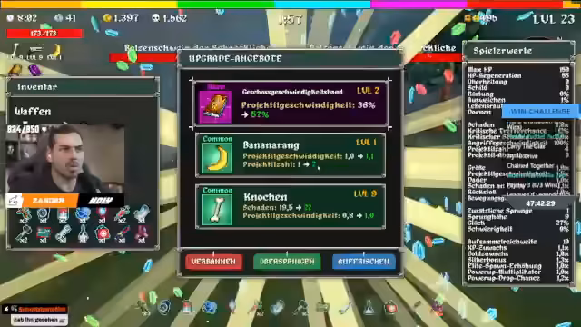 12:42:29Zu Beginn des Streamabschnitts ist der Streamer verwirrt über die Spielmechanik und verliert den Überblick über wichtige Spielobjekte wie Magnete. Er testet verschiedene Charaktere wie den Calcium und den Ogre, wobei der ihm aufgrund seines Skateboards und Double Jumps besonders viel Spaß macht. Die Charaktere und Waffen werden durch verschiedene Items wie 'Megaband' und 'Projektilanzahl' verbessert. Er kritisiert oft seine eigenen Entscheidungen und sucht im Chat nach Bestätigung für seine Item-Wahlen, was zu einer dynamischen und interaktiven Spielerfahrung führt.