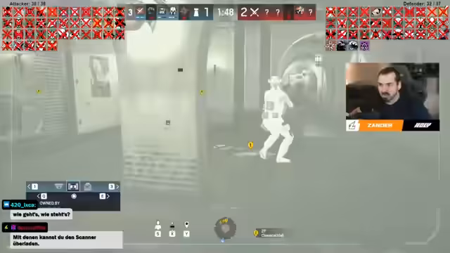 00:21:38Während des Streams zeigt der Streamer Fähigkeiten im Rainbow Six Siege Gameplay mit verschiedenen Operatoren wie Mozzie, Mira und Brava. Er diskutiert taktische Entscheidungen wie Platzierung von Kameras und Verwendung von Gadgets. Die Streamer muss auch mit unzuverlässigen Teammitgliedern umgehen, die manchmal eigene Taktiken verfolgen anstatt einer koordinierten Strategie zu folgen.